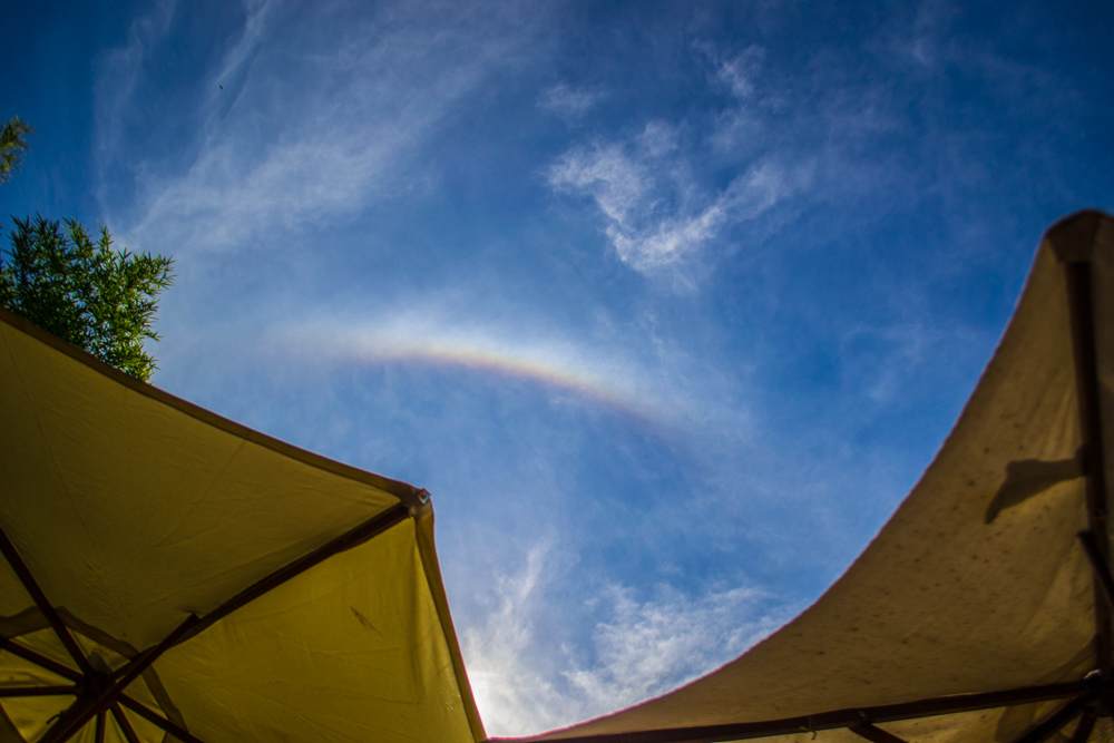 Las fotos. Imagen del sol entre dos sobrillas: se puede apreciar, en pleno día, un arco iris parcial:sólo tiene algunos colores. Una telaraña en «El bosque encantado», próximo a la ciudad de Gral. Belgrano» (provincia de Buenos Aires). Navidad en una ciudad francesa. Vista del techo de un centro comercial, construido con materiales de demolición, en ingeniero Maschwitz.