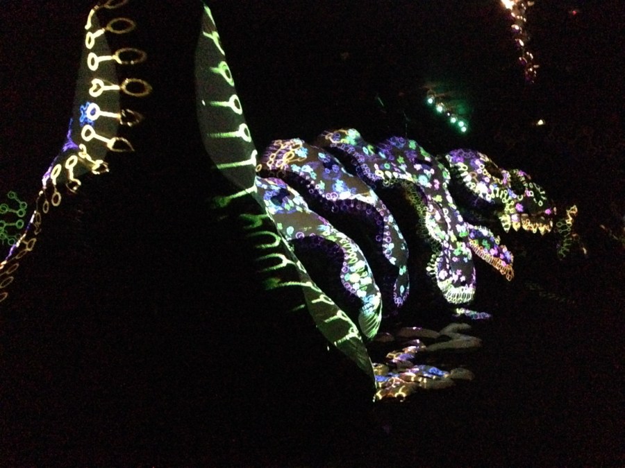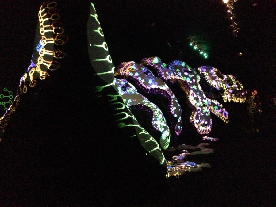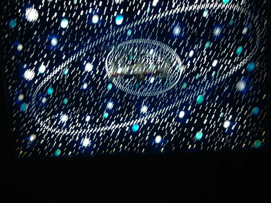 Voy esporàdicamente a visitar muestras de arte por el placer que me produce. Es algo especial y nada  fàcil de describir. En este momento hay una muestra en el Centro Cultural Recoleta (de acceso gratuito).Aunque no lo encontrè escrito, por las ilusiones que se despiertan: imàgenes de seres que no existen sino en sueños,ver una imagen luminosa que no se sabe que es , y desde el otro extremo uno descubre que consiste en la figura de un monstruo…pensè esto está dedicado ( o inspirado) por la obra de Borges. Algunos textos suyos,aquì y alla,lo confirmaron