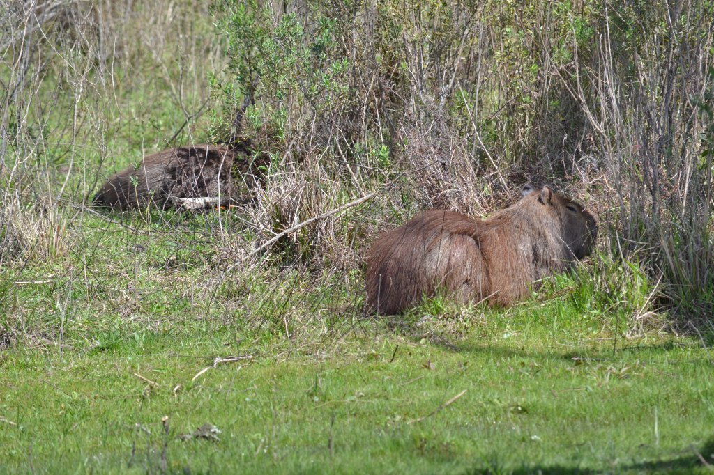 El capibara-conocido en Argentina como carpincho- es el roedor más grande del planeta. Animal pacifico, no agresivo que se alimenta de vegetales y que habita riberas de ríos de llanura o lagunas. Sus predadores principales , son el hombre ,los yacarés y los pumas. Se mantienen alejados de las personas en su estado salvaje. Un amigo llego a adoptar transitoriamente a una cachorro, que lo comenzó a seguir desde una laguna en la que estaba rodeado por animales de su especie. Mi amigo Manuel, montado a caballo, vio que al regresar a su casa-distante a un par de kilómetros de la laguna- el animalito lo seguía y no logró dejarlo en su hábitat.A partir de entonces creció en la casa, conviviendo con perros y animales de granja. Cada vez que Manuel iba a la laguna, se hacía acompañar por el carpincho. Pero él siempre regresaba a la vivienda humana.Hasta que ya adulto, le llego el momento de la atracción sexual y se reintegró a su comunidad-